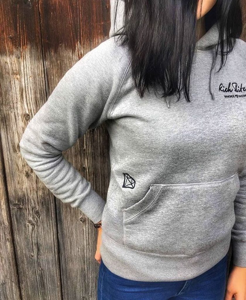 Hanorac gri cu glugă și logo pe piept.