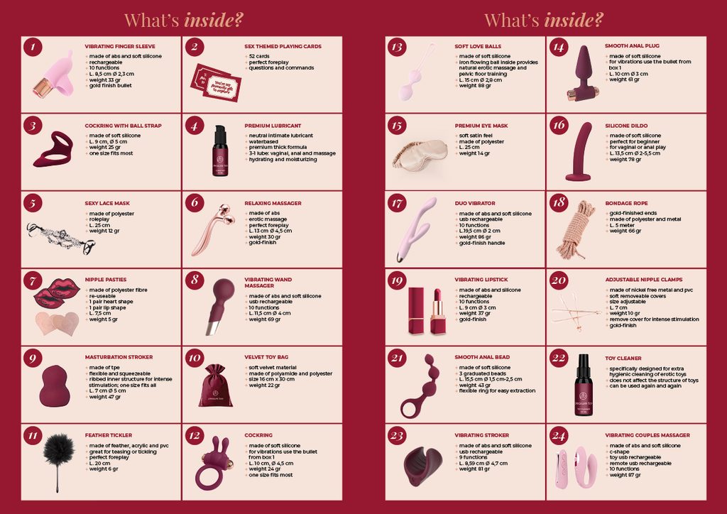 Cutia cadou elegantă nu este doar un simplu dar – este o invitație de a trăi intimitatea și pasiunea. Fie că îți răsfeți propriile simțuri, îți surprinzi partenerul sau aduci bucurie unui prieten, acest calendar seducător este modalitatea perfectă de a-ți îmbogăți momentele senzuale.