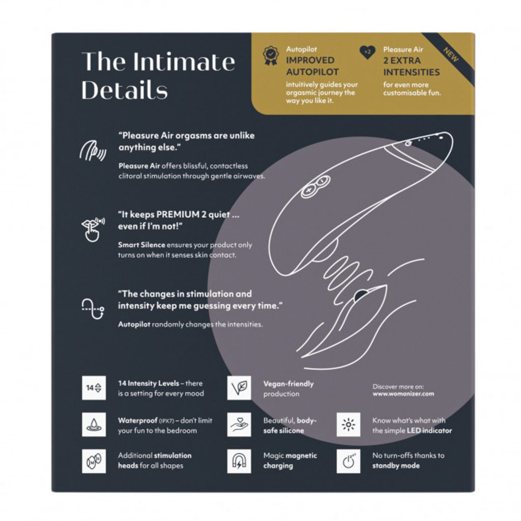Womanizer Premium 2 este un stimulator puternic, dar silențios, cu unde de presiune, care oferă plăcere prin 14 niveluri diferite de intensitate. Intensitatea poate fi ajustată cu ușurință folosind butonul (+/-). Tehnologia patentată Pleasure Air oferă o stimulare precisă a clitorisului fără contact direct. Poate fi utilizat și în cadă sau duș, deoarece este rezistent la apă. Funcția nouă și îmbunătățită de autopilot schimbă automat intensitatea, oferind surprize plăcute. Womanizer Premium 2 se activează doar la contactul cu pielea datorită funcției Smart Silence. Până atunci, Premium 2 rămâne în modul standby aproape silențios. Se oprește automat după 10 minute de inactivitate.