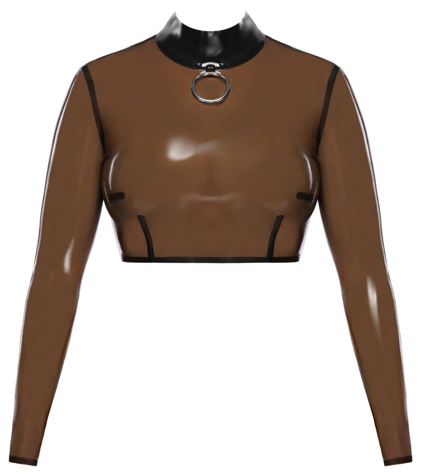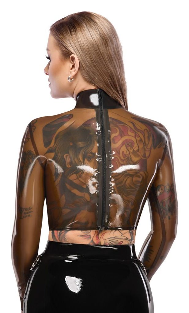 Ridicați-vă garderoba fetish la un nou nivel cu această piesă exclusivistă de la brandul premium LATE X. Acest crop-top de damă cu mânecă lungă, într-o variantă provocatoare gri-fumuriu transparentă, este combinația perfectă de eleganță, dominanță și senzualitate debordantă.