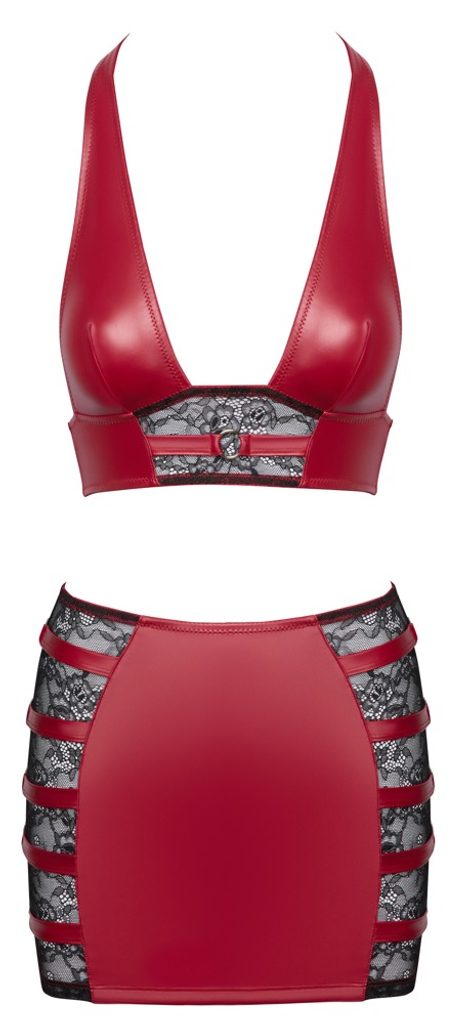 Bucurați-vă de un look îndrăzneț și elegant cu acest set unic de la Cottelli PARTY. Combinația senzuală de material roșu wetlook și dantelă neagră delicată creează un echilibru perfect între provocare și eleganță.