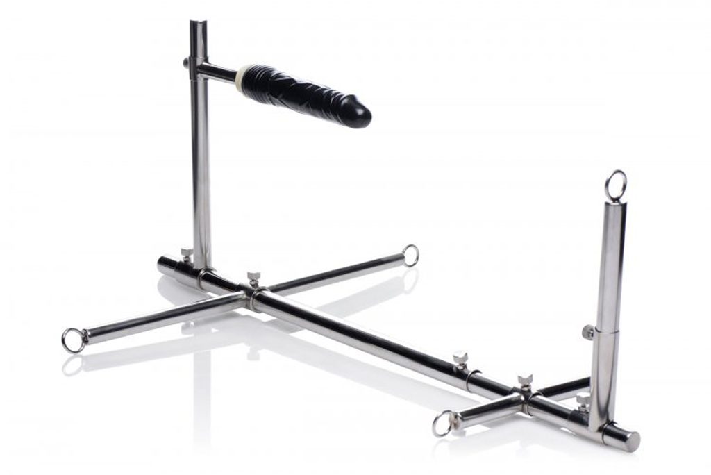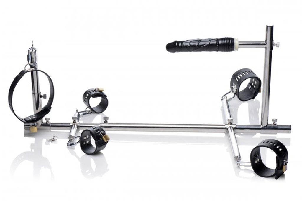 Dimensiuni: lungimea totală a barei principale 66 cm - 120 cm, bara pentru încheieturi 27 cm, bara pentru glezne 52 cm, înălțimea dildo-ului 3 cm - 29 cm, distanța dildo-ului de suport 28 cm, lungimea gulerului 49,5 cm, lățimea gulerului 4,4 cm, lungimea cătușelor pentru glezne 32,5 cm, lățimea cătușelor pentru glezne 5,9 cm, lungimea cătușelor pentru încheieturi 25 cm, lățimea cătușelor pentru încheieturi 4,4 cm, înălțimea carabinelor 5,5 cm, lățimea carabinelor 3 cm, înălțimea lacătului 3 cm, lățimea lacătului 2 cm, lungimea dildo-ului 19 cm, diametrul 4,5 cm.