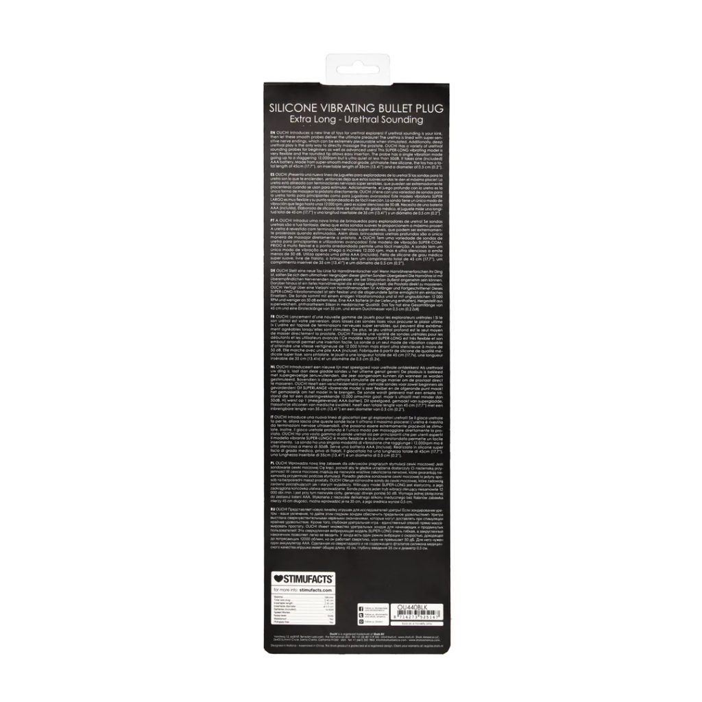 OUCH! oferă o gamă variată de sonde – de la modele pentru începători la utilizatori experimentați. Acest model vibrator super lung este extrem de flexibil, cu un vârf rotunjit pentru o introducere ușoară. Dispune de un singur mod de vibrație cu o viteză de până la 12.000 rotații pe minut, fiind în același timp foarte silențios (mai puțin de 50 dB). Funcționează cu o baterie AAA, care este inclusă în pachet.