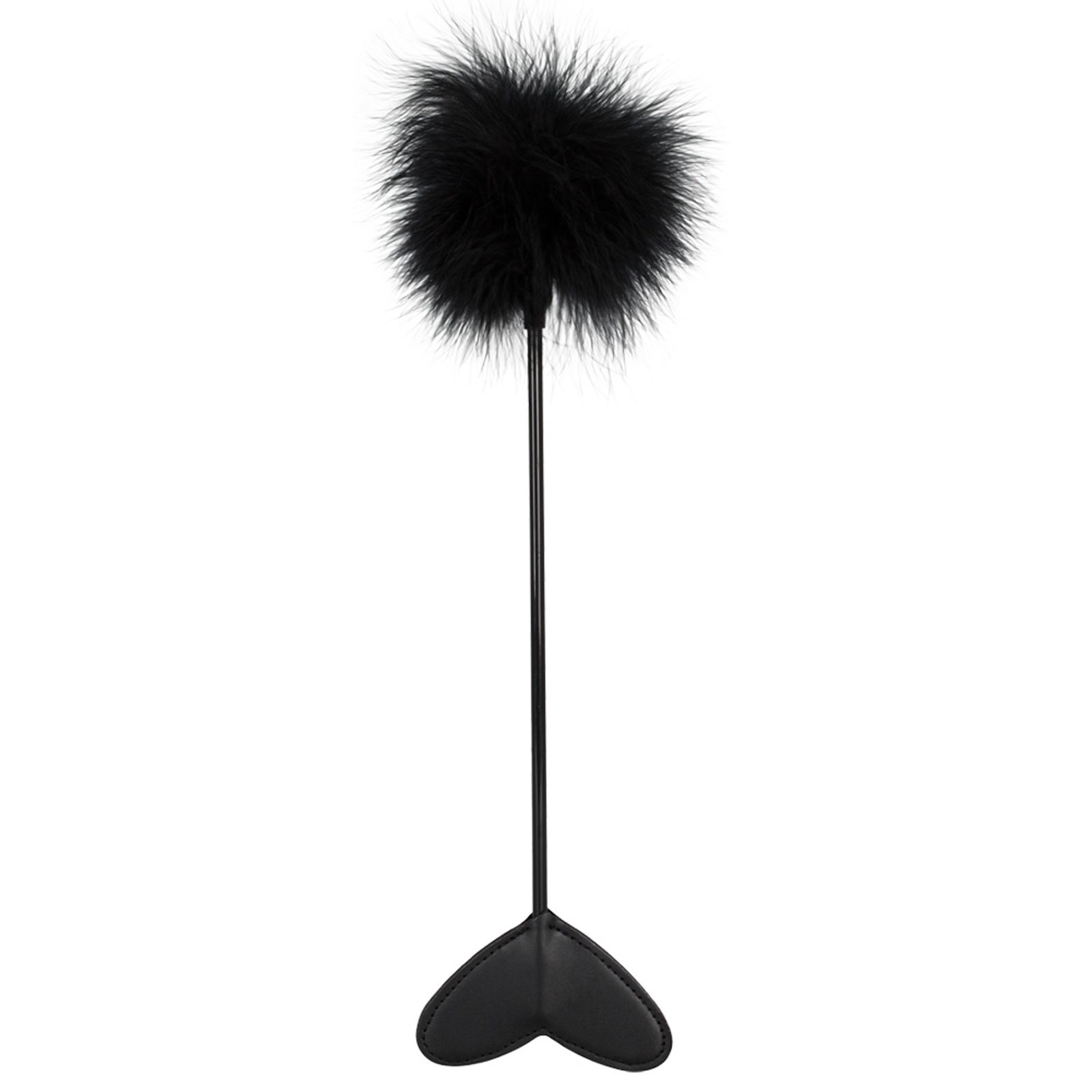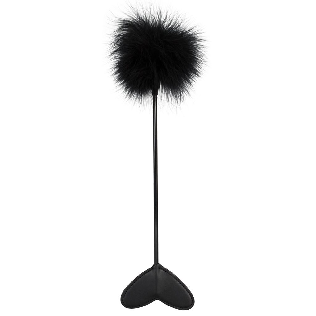 Un bici negru de aproximativ 25 cm, în formă de inimă, cu un capăt din piele artificială și pene negre la celălalt capăt.