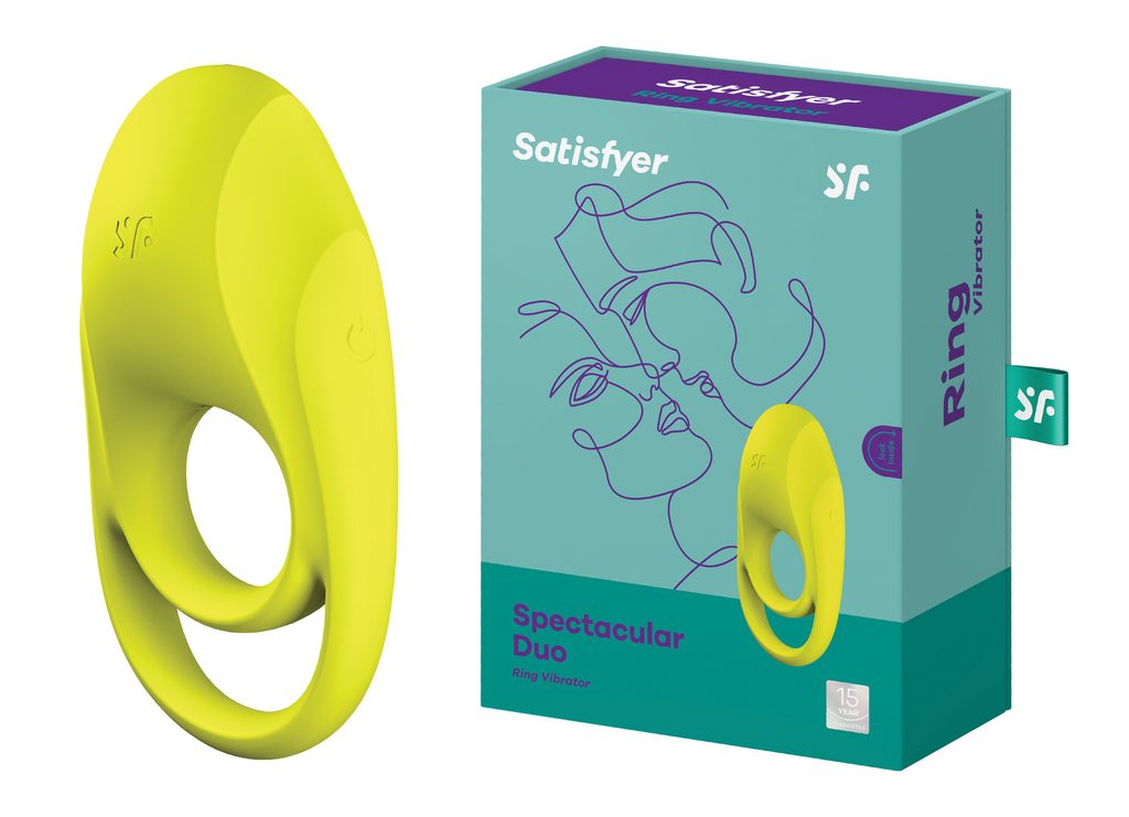 Pregătește-te să te bucuri de momente spectaculoase de plăcere: Satisfyer Spectacular Duo este un inel de calitate superioară pentru penis și testicule, realizat din silicon, care oferă senzații mai intense în timpul actului sexual și îți permite să reziști mai mult. Inelele sale interioare înconjoară penisul, iar cele exterioare testiculele, creând un efect de stimulare prin stagnarea sângelui. În același timp, partenerul tău va fi răsfățat de stimulatorul clitoridian al inelului vibrator, care, datorită formei sale voluminoase, oferă o stimulare deosebit de intensă. Cele 12 programe de vibrații pot fi controlate cu ușurință printr-un buton tactil lateral.