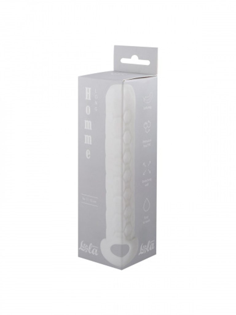 Manșonul Long din colecția Homme este ideal pentru penisuri de 11-15 cm și permite prelungirea lungimii penisului. Inelul de fixare pentru scrot nu doar că menține manșonul la locul său, ci îmbunătățește și erecția prin compresie. Textura ambivalentă, nerealistă a manșonului poate stimula ambii parteneri în timpul actului sexual, oferindu-le astfel o experiență mai plăcută.