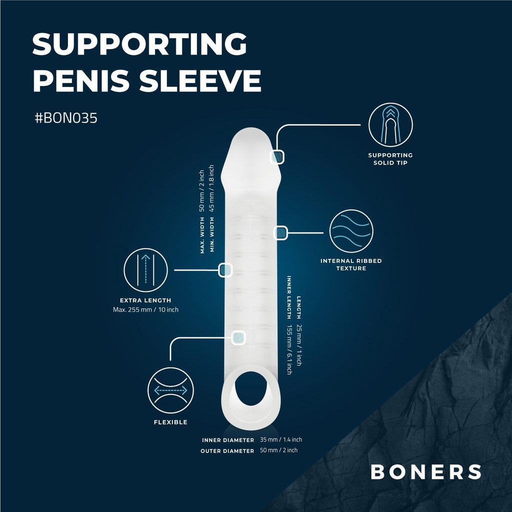 Adăugați lungime și circumferință penisului cu acest manșon din colecția Boners! Manșonul extinde penisul cu 5 cm. Coastele din interior oferă rezistență suplimentară și stimulare. Manșonul este moale și flexibil, dar ferm atunci când este purtat. Acest lucru îl face potrivit și pentru bărbații cu disfuncție erectilă.