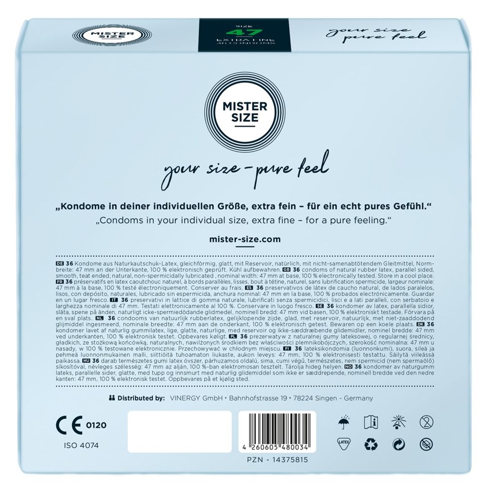 Faptul că MISTER SIZE 47 este cea mai mică dintre cele șapte mărimi nu trebuie să vă îngrijoreze deloc. Un penis subțire oferă o mai mare flexibilitate în timpul actului sexual și poate oferi cele mai intense senzații - mai ales cu pregătirea potrivită. Prezervativul personal este ca un costum croit pe măsura dumneavoastră pentru ocazii speciale: Totul se potrivește perfect, iar dumneavoastră vă veți simți în cea mai bună formă. De acum înainte, vă puteți bucura de această senzație la fiecare contact intim.
