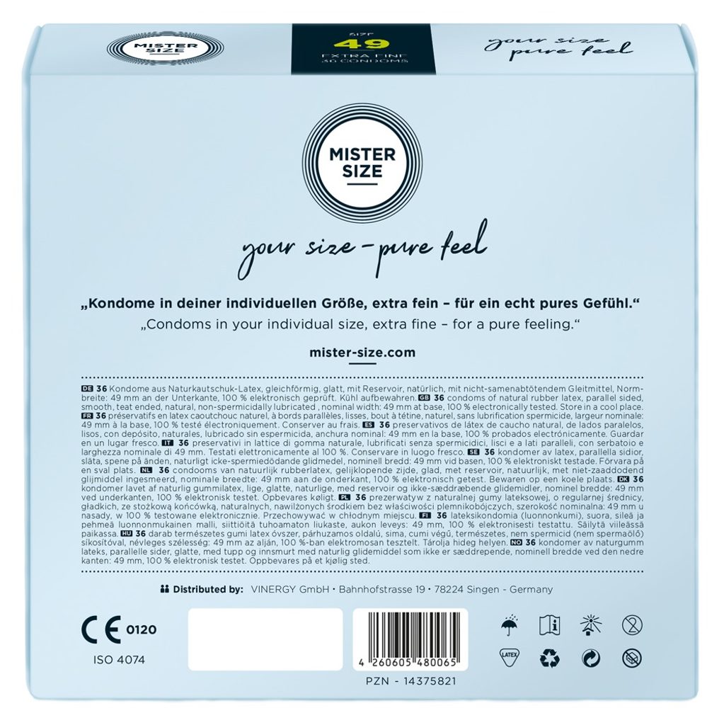 MISTER SIZE 49 este partenerul ideal pentru penisul tău sensibil și elegant. Împreună veți trăi momente minunate de extaz suprem - pentru că nu ai nevoie de un penis imens pentru a muta munții. Pentru atingeri intime care provoacă fiori de fericire în corpurile voastre, ai nevoie de senzația potrivită. Bucură-te pe deplin de acest moment. MISTER SIZE 49 îți oferă protecție fără să pierzi nici măcar un strop de sensibilitate.