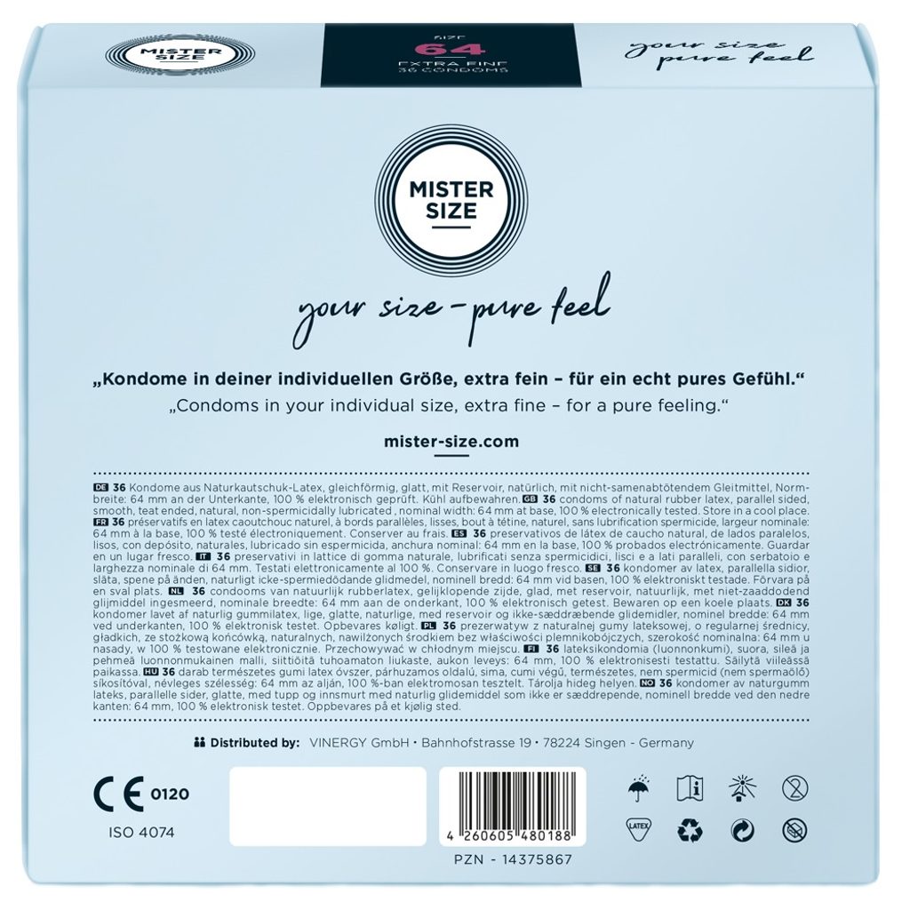 Cu MISTER SIZE 64, ați găsit în sfârșit prezervativul care vă oferă o senzație complet plăcută. Disconfortul, răsucirea și tensiunea constantă sunt de domeniul trecutului - acum începe plăcerea pură. La desfășurarea liberă înainte de actul sexual, penisul dumneavoastră robust și bine întreținut și prezervativul se unesc într-un ansamblu perfect, oferind momente minunate de plăcere senzuală. Bucurați-vă de momentele voastre!