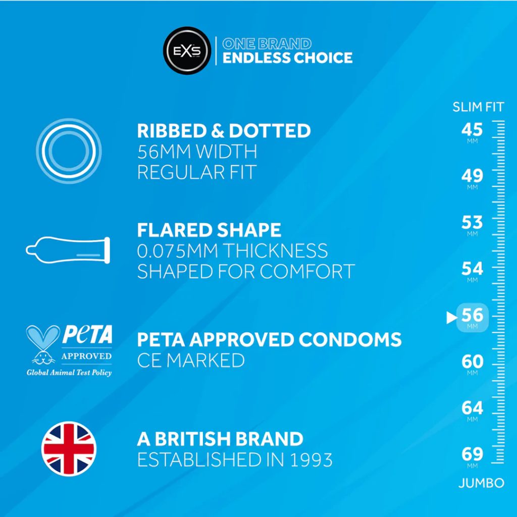Prezervativele EXS Extreme 3in1 sunt concepute pentru stimulare "extremă". Prezervativele sunt proiectate cu un vârf prelungit pentru confort maxim. Coastele și punctele special aranjate, împreună cu forma potrivită a prezervativului cu vârf extins, vă oferă o plăcere suplimentară și confort maxim.