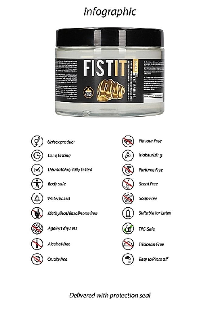 FIST IT este un lubrifiant pe bază de apă. Potrivit pentru utilizare cu prezervative din latex. Testat dermatologic, fără grăsimi, fără culoare, fără miros și fără gust.