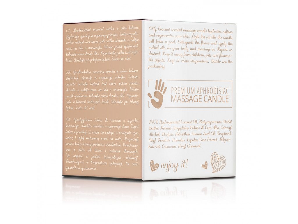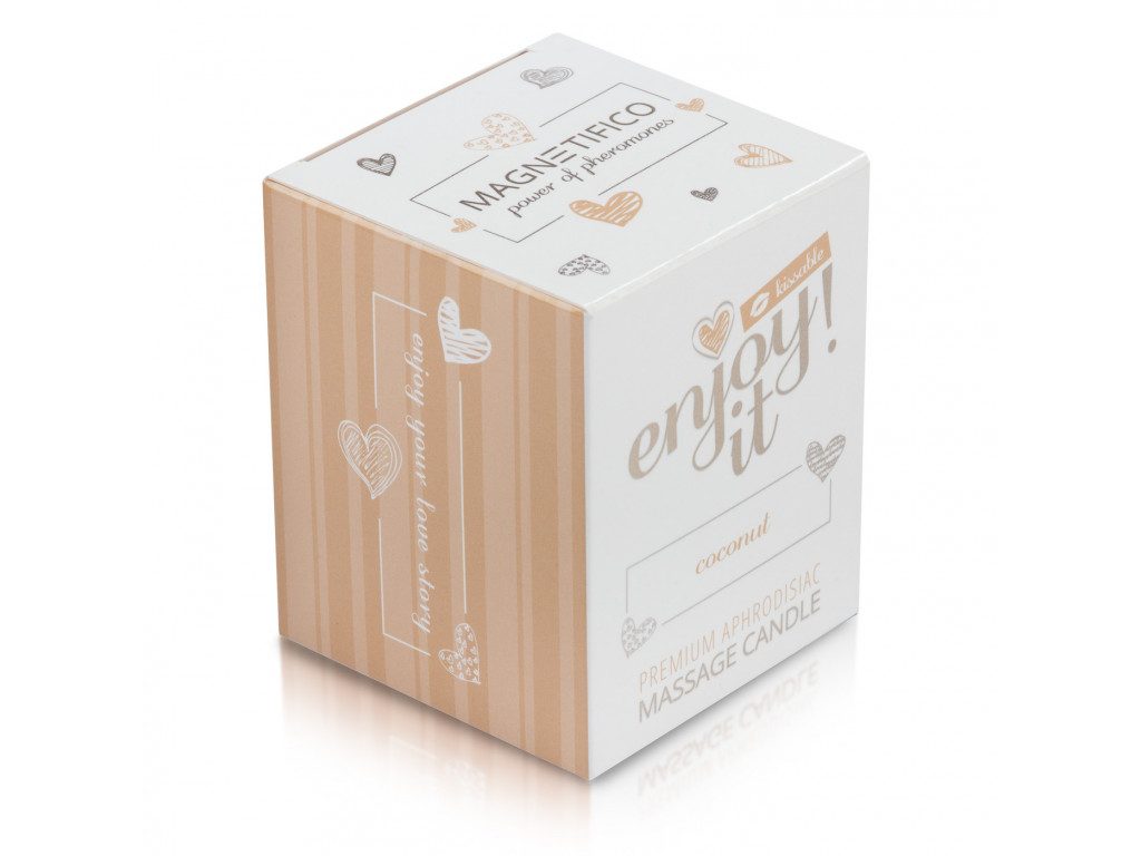 O lumânare de masaj este destinată masajului întregului corp. Conține un amestec special format din unt de shea, ulei de cocos, ceară de albine, antioxidanți și alte ingrediente care, după aprinderea lumânării, se topesc în câteva minute într-o emulsie de masaj, ce poate fi turnată pe corpul partenerului pentru un masaj de neuitat. Compoziția premium a lumânării de masaj MAGNETIFICO Enjoy it! hidratează, hrănește și regenerează pielea, lăsând-o moale la atingere, iar parfumul senzual intensifică experiența momentelor petrecute împreună.