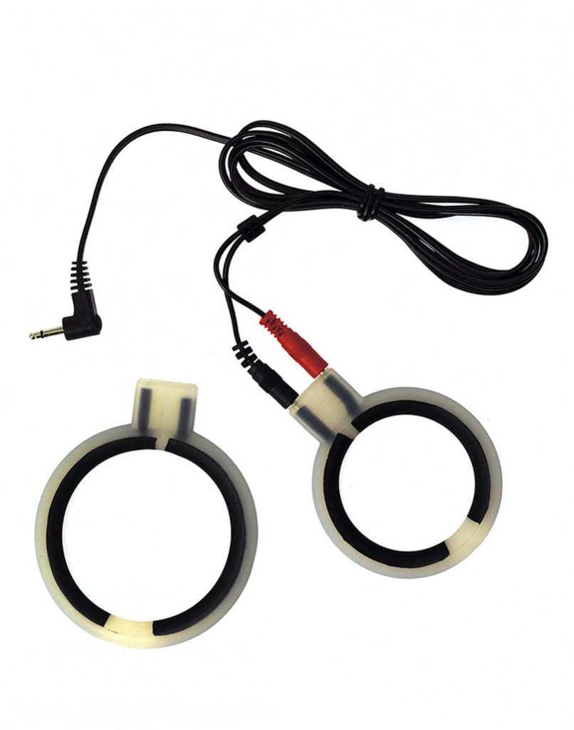 Set de inele moi din silicon pentru erecție cu fir de plumb. Aceste inele rotunde sunt bipolare și pot fi utilizate individual sau împreună. Părțile negre sunt conductive. Firul are un conector jack de 2,5 mm, compatibil cu cele 3 unități de alimentare ref. #7850, #7880 și #7890. Asigurați-vă că utilizați o cantitate suficientă de gel de contact pentru un contact optim cu pielea.