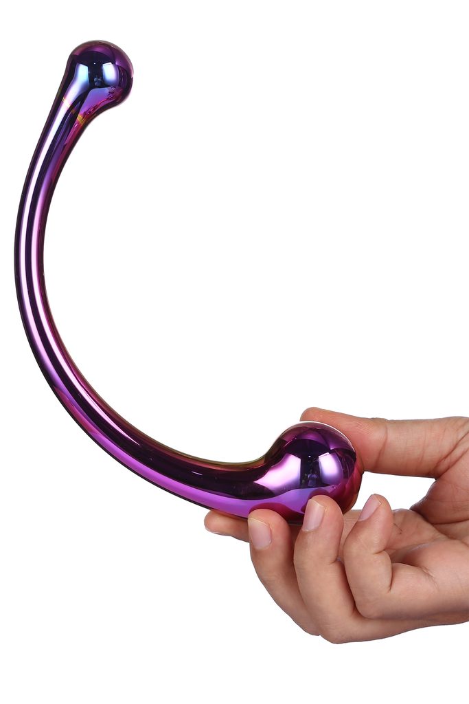 Datorită formei sale curbate, este ideal pentru țintirea precisă a punctului G. Capetele sferice de pe ambele părți permit modificarea presiunii și a intensității în funcție de preferințe. Designul cu utilizare pe ambele capete crește versatilitatea și oferă spațiu pentru a experimenta diferite unghiuri și senzații. Finisajul luxos multicolor, cu reflexii fine irizate, îi conferă un aspect elegant și sofisticat – culorile sunt integrate direct în sticlă, astfel încât nu se zgârie și nu își pierd intensitatea.