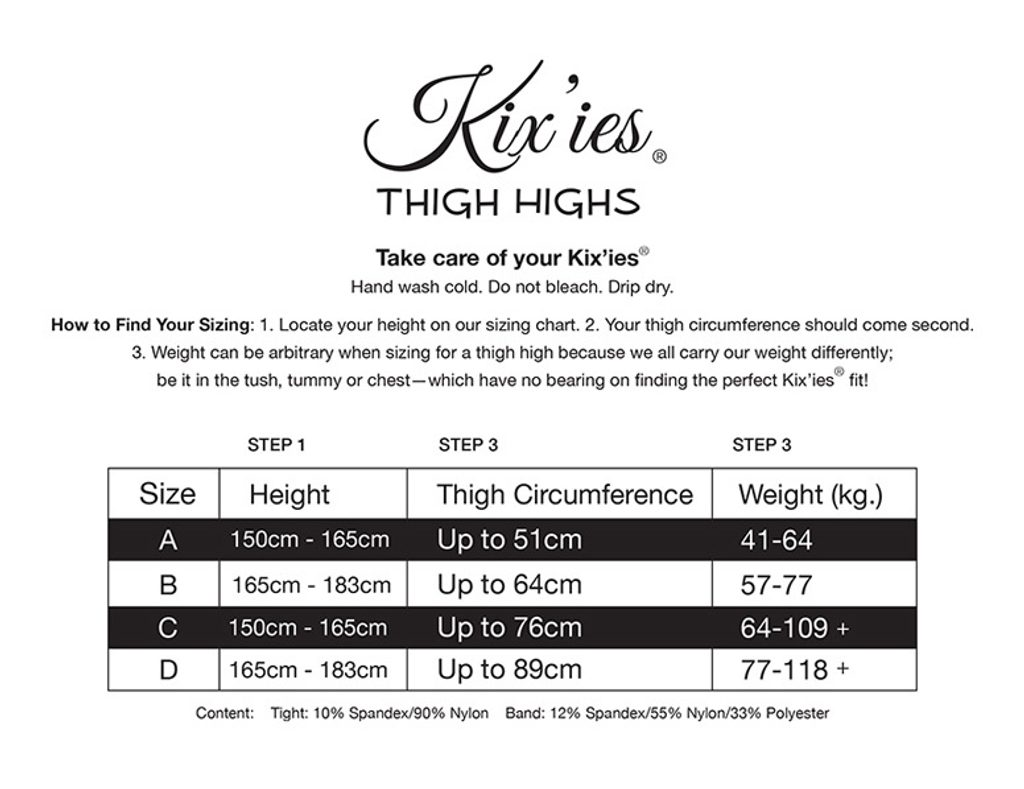 Mărime: Măsurați mai întâi înălțimea și apoi circumferința coapsei. Greutatea nu contează atunci când alegeți mărimea pentru coapse. Fiecare dintre noi distribuie greutatea diferit – fie în zona abdomenului, fie a șoldurilor sau a coapselor – acest lucru nu afectează găsirea potrivirii perfecte pentru Kix'ies ®! Este timpul să renunțați la dresurile clasice cu elastic și la șosetele demodate!