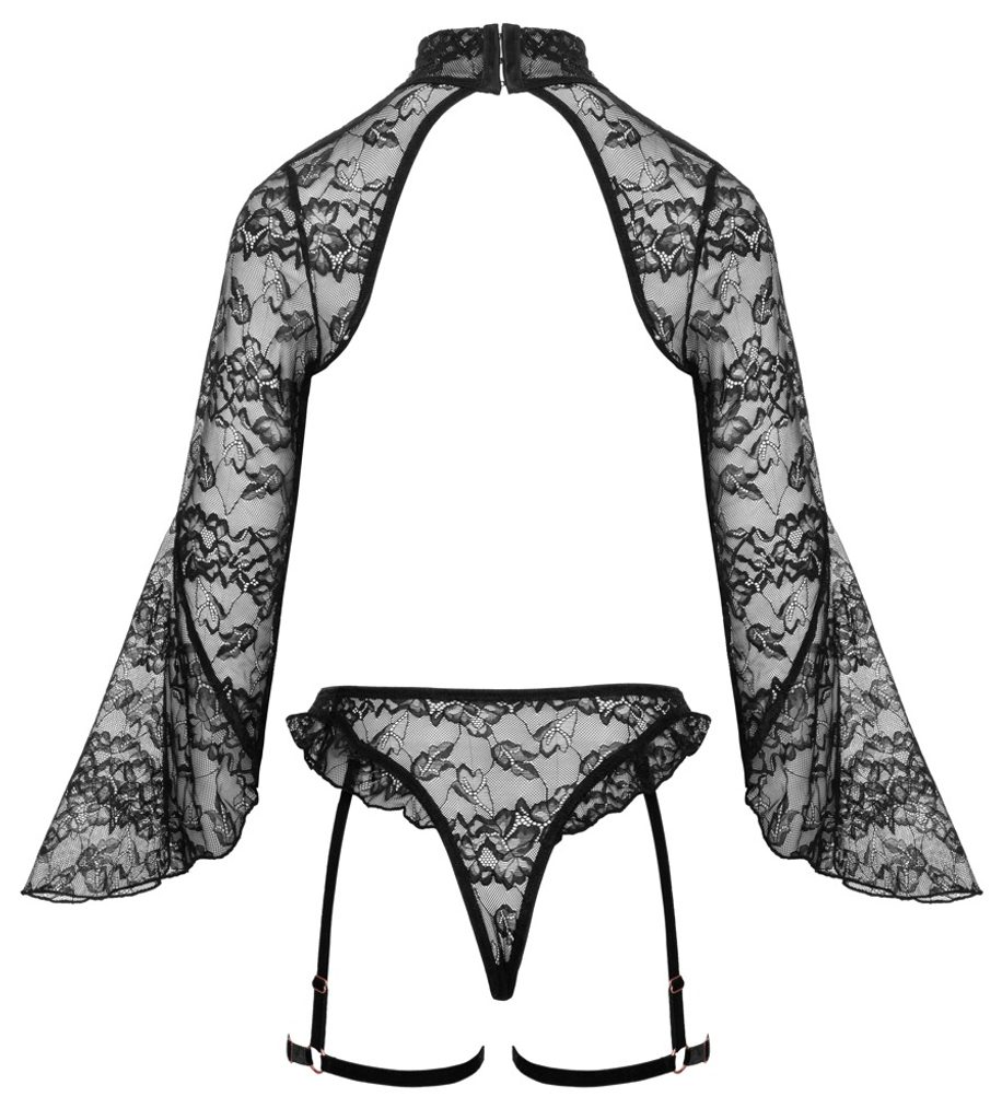 Acest set crotchless este format dintr-un bolero cu cupe deschise și chiloți portjartier, care evidențiază silueta și atrag atenția asupra fiecărui detaliu. Combinația de dantelă florală și elemente din catifea arată elegant și, în același timp, jucăuș.