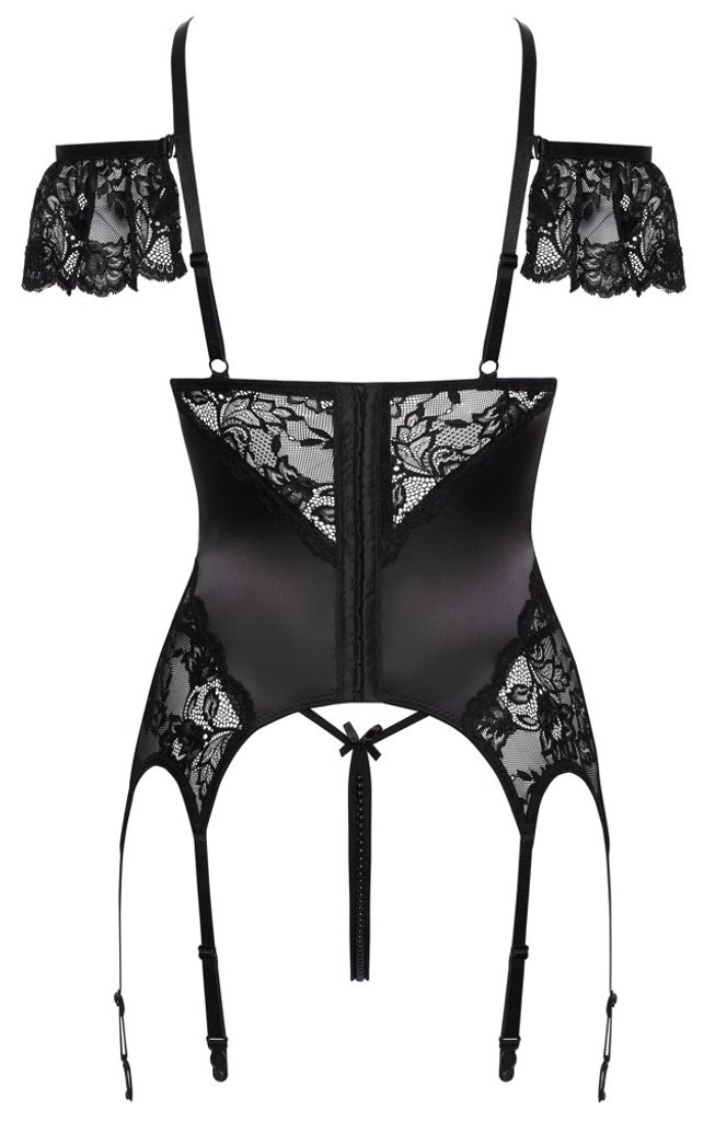 Acest set negru din două piese este format dintr-un corset (basque) și chiloți tanga crotchless. Materialul satinat lucios este completat de dantelă delicată și fundițe mici, care oferă modelului un caracter feminin și sofisticat. Datorită finisajului moale și elastic, setul se adaptează confortabil corpului.