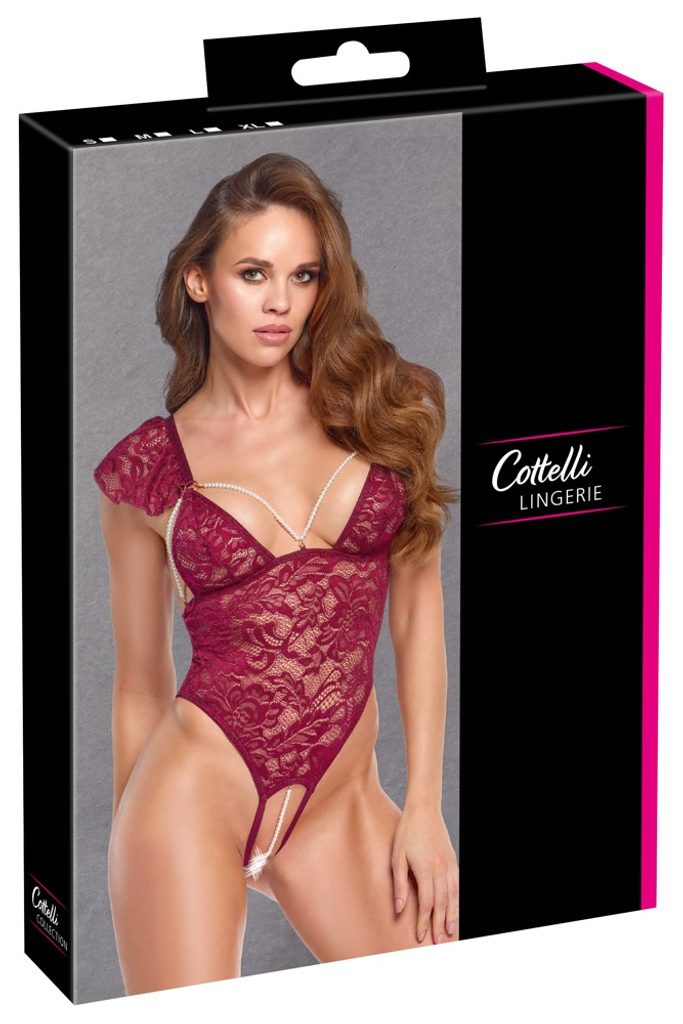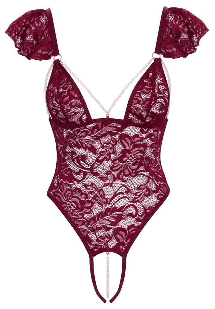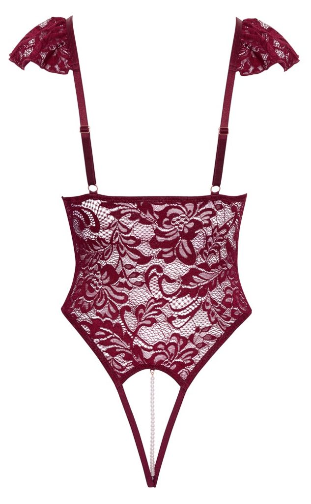 Acest body tip tanga cu decupaj în zona inghinală, într-o nuanță intensă de roșu vișiniu, este realizat din dantelă florală moale și elastică, care îmbrățișează frumos corpul și oferă confort la purtare. Un element de impact este dantela peste umeri, ce adaugă modelului un aspect interesant și elegant.