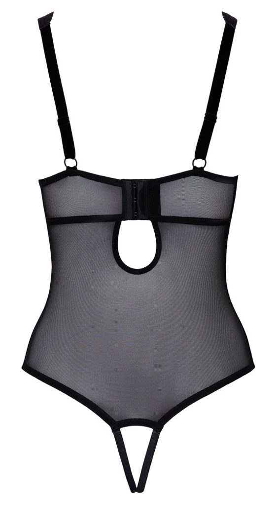 Body cu zona intimă deschisă de la Cottelli LINGERIE, realizat dintr-un amestec delicat de powernet și dantelă florală. Cu un decolteu frumos și adânc. Sub banda de catifea de sub bust strălucește un element decorativ cu pietre. Zona intimă este seducător de deschisă. Spatele din powernet cu închidere reglabilă cu cârlige. Bretelele sunt, de asemenea, reglabile pentru o potrivire perfectă.