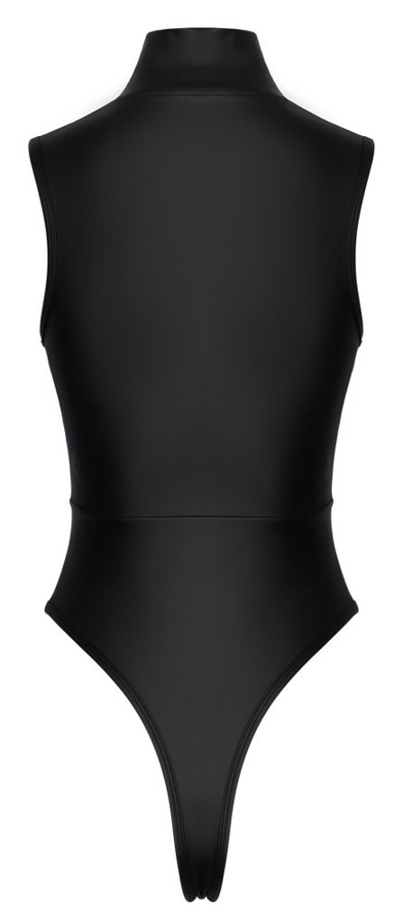 Body-ul accentuat de la Cottelli PARTY este realizat dintr-un material negru mat la modă. Are un fermuar lung cu pietre strălucitoare, care merge de la guler până peste zona intimă. Body-ul este tanga, cu picioare foarte înalte care evidențiază perfect picioarele și fesele. Materialul mat elastic se mulează strâns, dar confortabil pe corp.