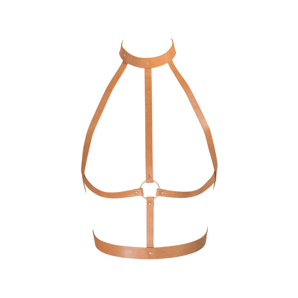 The product is a stylish harness inspired by corsets and bondage, designed to enhance both outfits and lingerie. It can also be worn directly on the skin to add intensity to intimate moments. The harness is made from high-quality vegan leather and includes a neck size range of 31–41 cm and an underbust circumference of 60–80 cm. The materials used are 95% polyurethane and 5% iron chain. The product is brown in color and weighs 380 g.